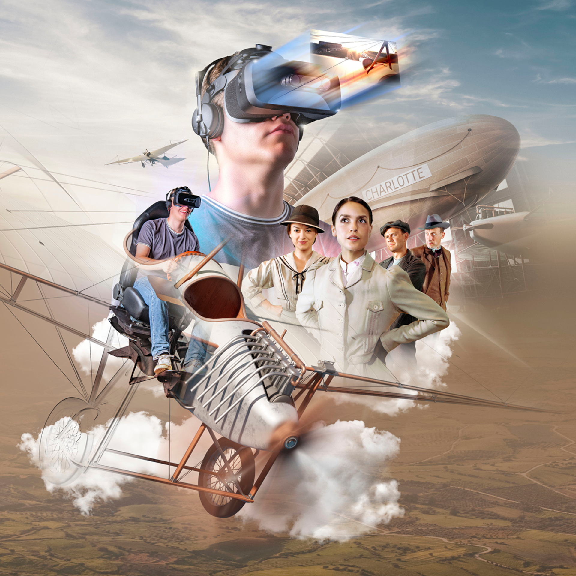 Das Virtual-Reality-Erlebnis „Aufwind“ bietet eine Zeitreise in die frühen Tage des Flugwesens. Gäste schlüpfen in die Rolle der berühmten Essener Flugpionierin Thea Rasche. Rasche, eine der ersten Kunstflugpilotinnen der Welt, wird im Rahmen dieser interaktiven VR-Erfahrung zum Symbol für Mut und Selbstbestimmung. Die Kombination aus Film und virtueller Realität lässt die Teilnehmenden durch das historische Essen des frühen 20. Jahrhunderts fahren und schließlich vom ehemaligen Flughafen Essen-Rotthausen abheben. Dank des "Motion Seats" wird das Erlebnis physisch spürbar – Wind, Hitze, Kälte und Vibrationen machen die virtuelle Umgebung lebendig, während die Steuerung von Fahrzeug und Flugzeug den interaktiven Charakter verstärkt.