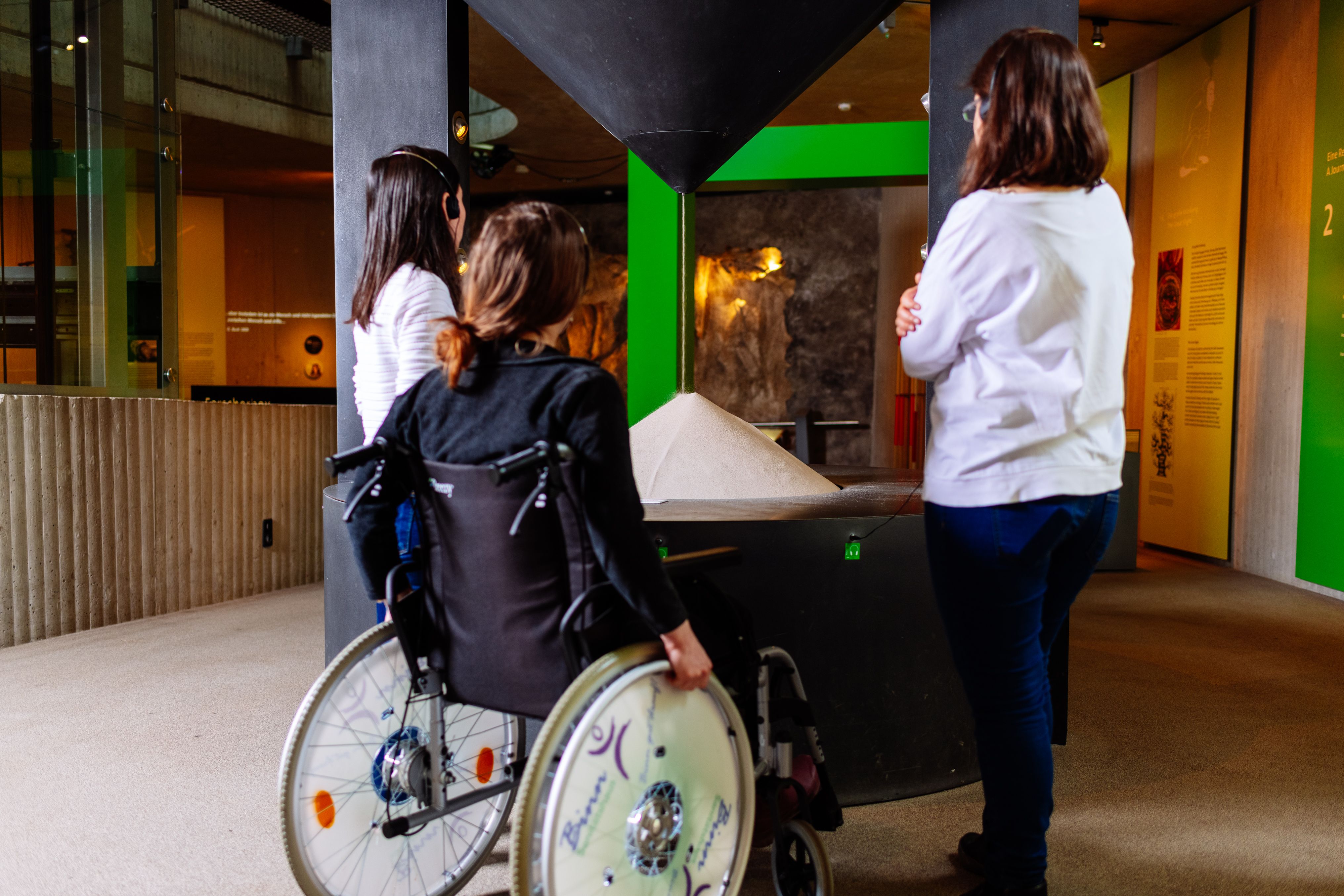 - Die Exponate und die Informationen zu den Exponaten sind überwiegend im Sitzen sichtbar.