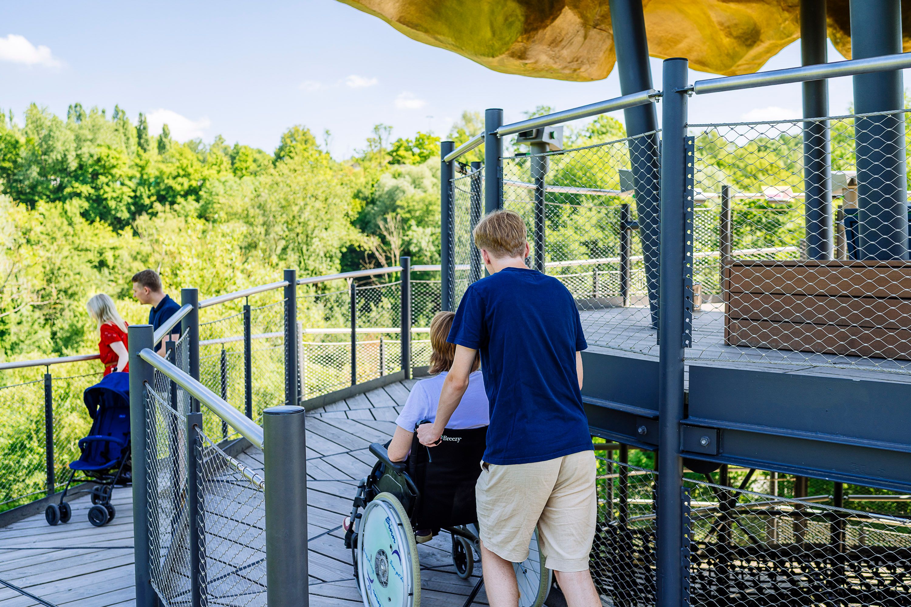 - Der Weg zur Fundstelle mit Höhlenblick ist ca. 500 m lang. Der Turm sowie der Weg dorthin ist leicht begeh- und befahrbar und hat eine maximale Längsneigung von 6 %.