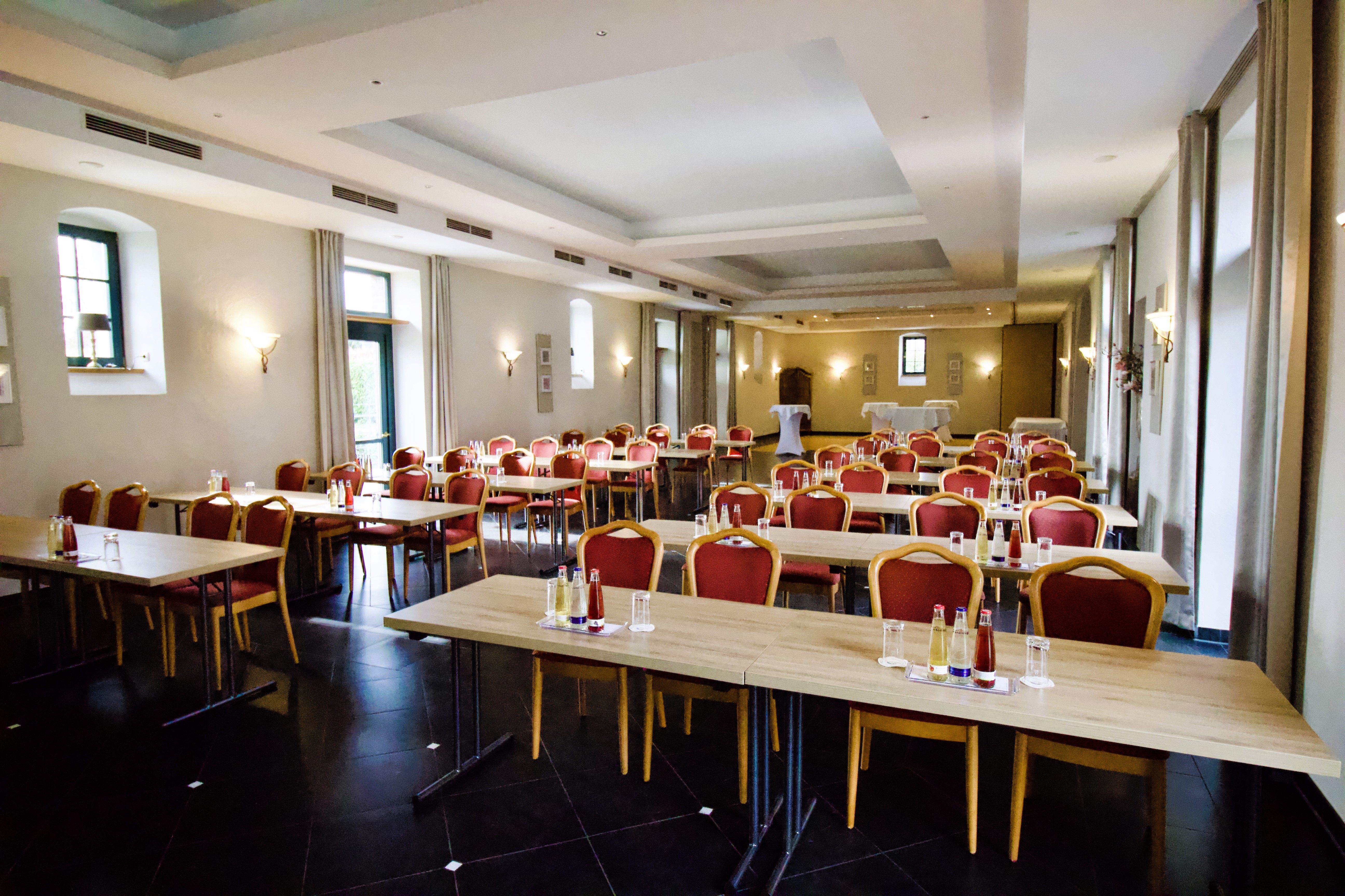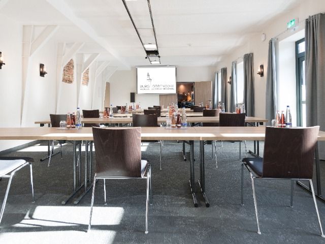 Die lichtdurchfluteten Tagungsräume bieten Platz für bis zu 170 Teilnehmende und sind mit moderner Technik ausgestattet. Vier flexible Räume sowie großzügige Außenflächen ermöglichen individuelle Veranstaltungskonzepte – vom Workshop im Freien bis zum Seminar im gemütlichen Burggemäuer. Der weitläufige Burgpark eignet sich ideal für Teambuilding und Pausen in der Natur.
