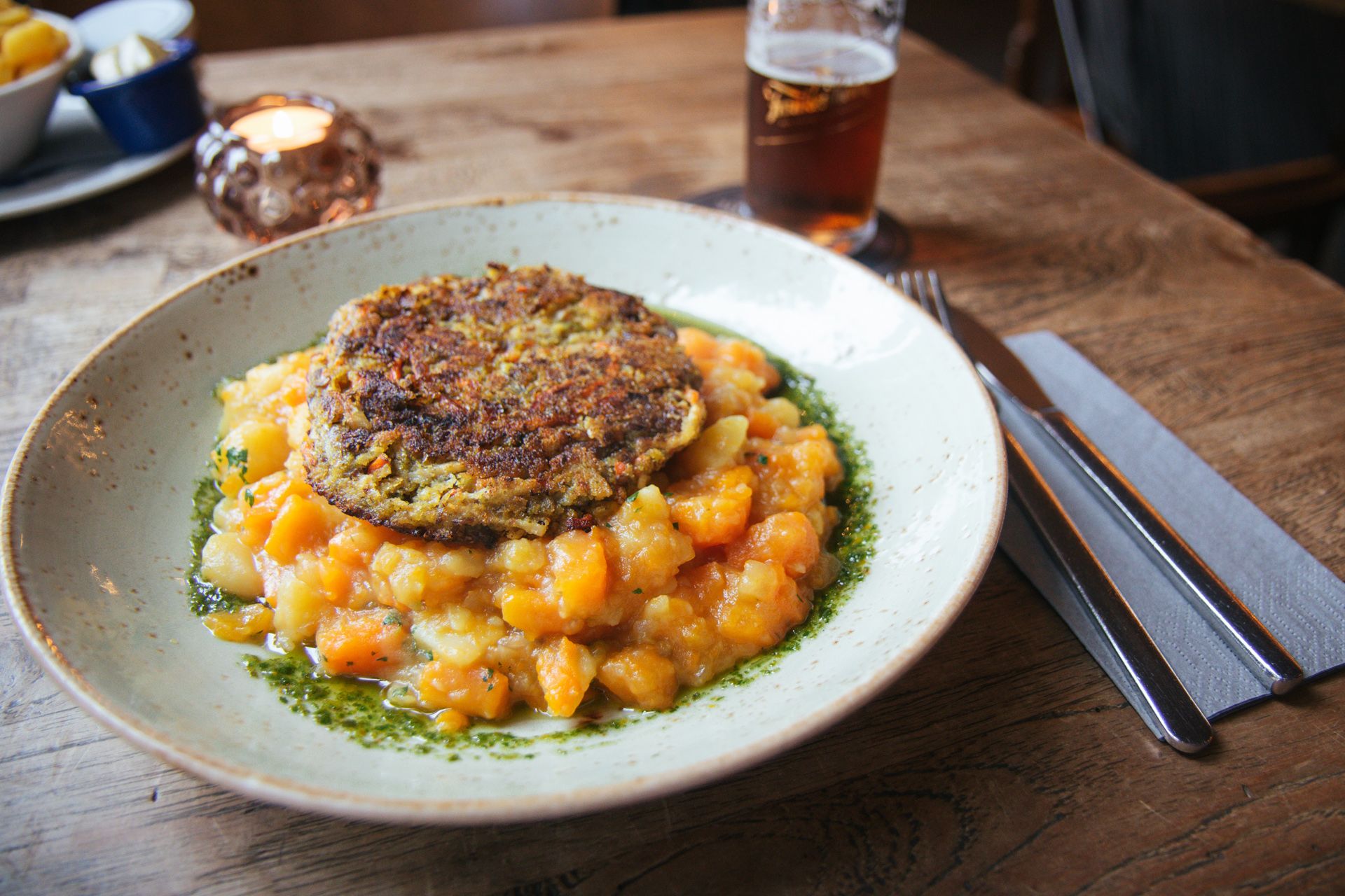 Mit der Zeit meldet sich mein Magen und es geht zurück zum Schlossplatz: Im Restaurant Schwan traue ich mich, dank der Überzeugungskraft des Küchenchefs, an eine vegane Frikadelle mit Möhren-Kartoffelgemüse und Rucola-Öl heran. Und es ist genau das, was ich nach so einem langen Tag brauche: Wohlfühl-Essen für die Seele. Und dieses sensationell nussige Rucola-Öl hätte ich bitte gerne literweise zum Mitnehmen!