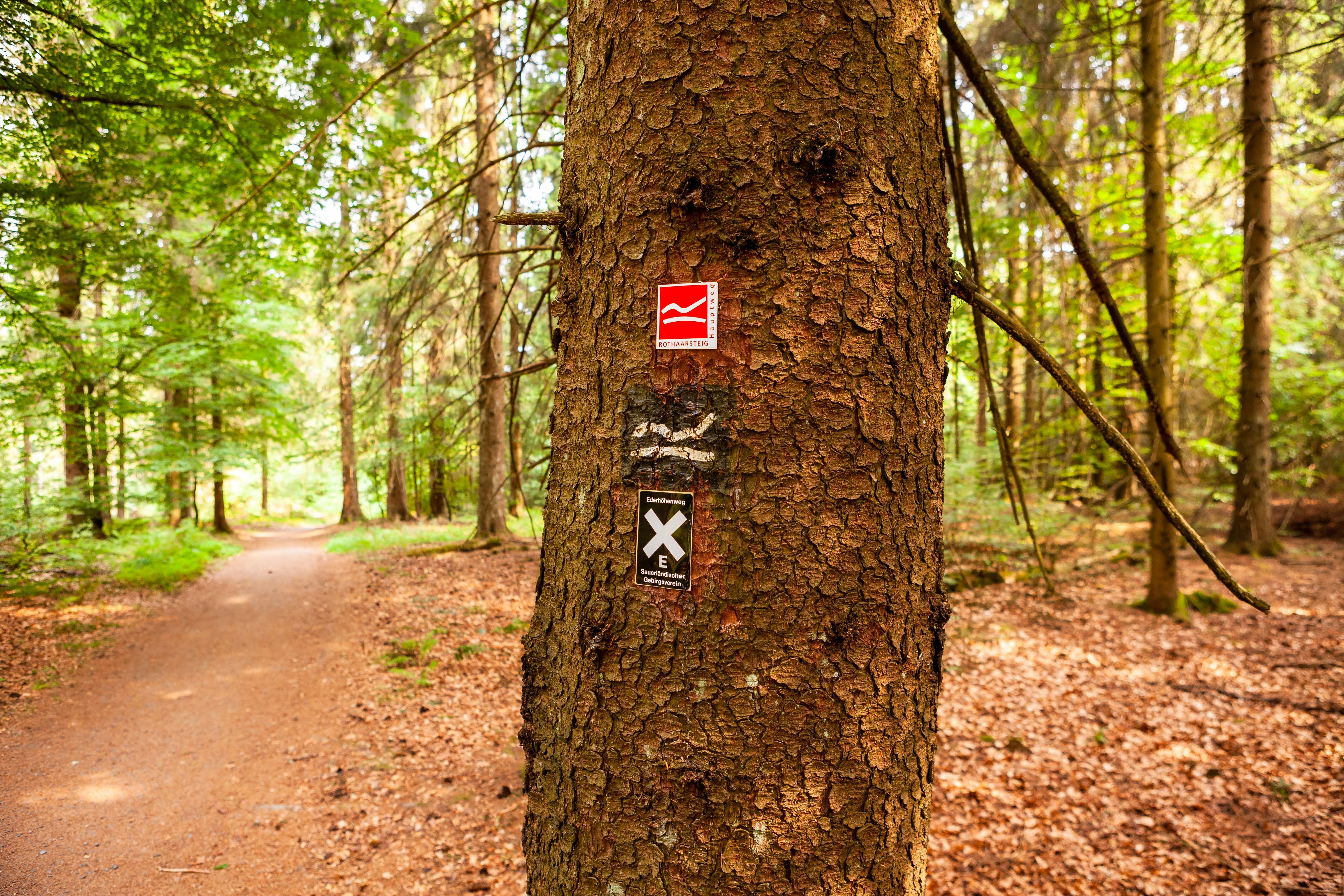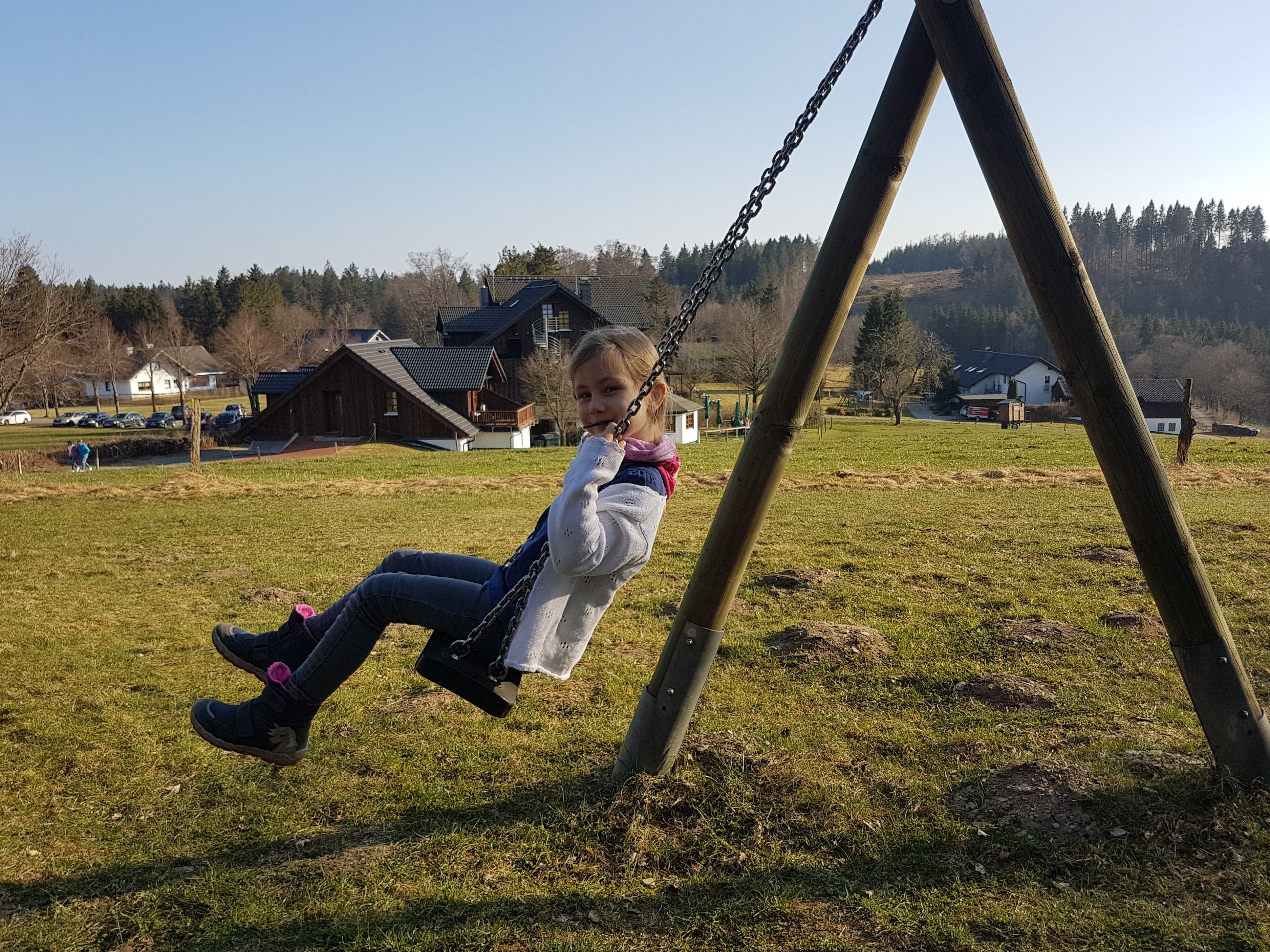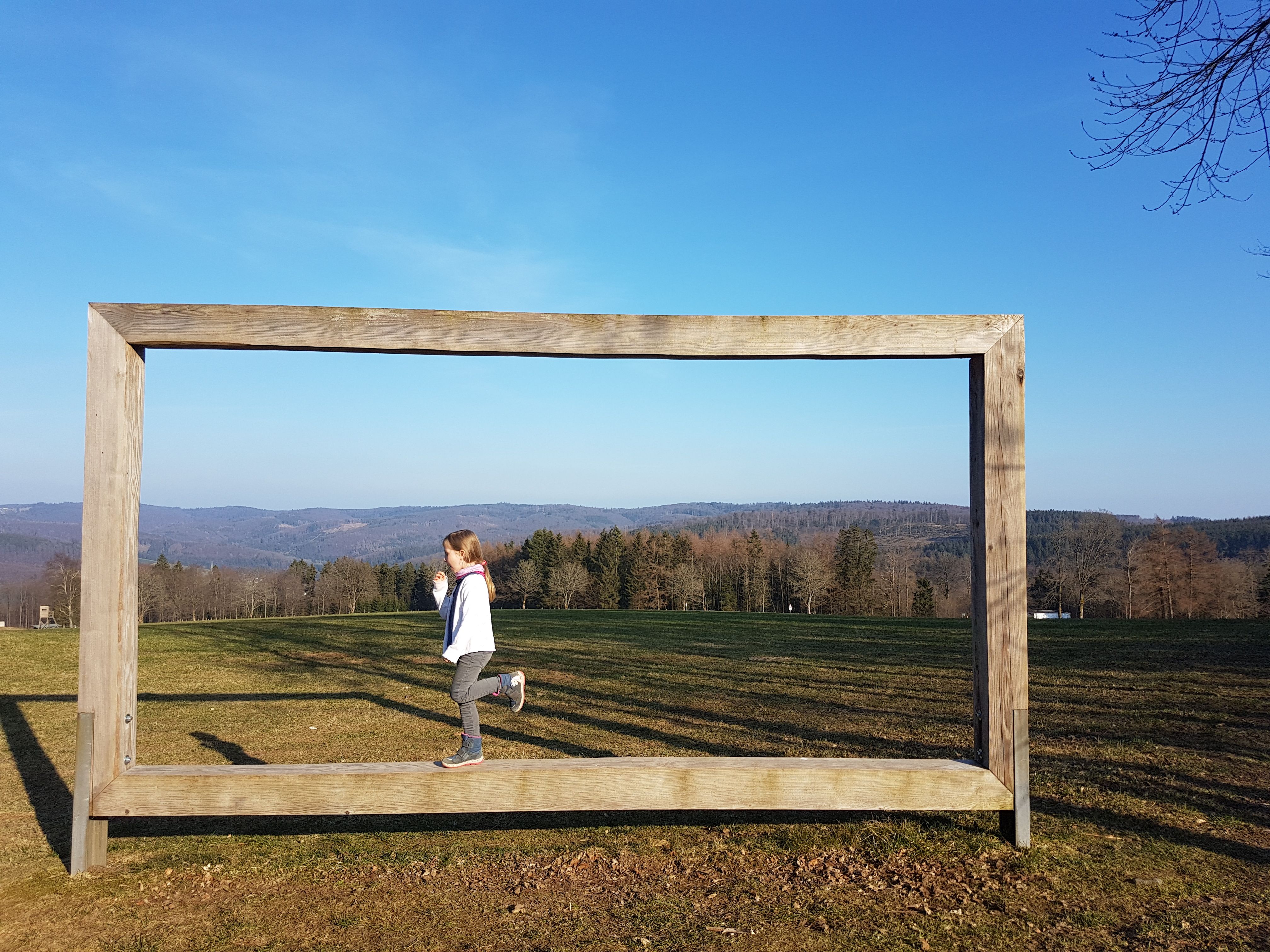 "Guckt mal", ruft unsere Mittlere auf Höhe der Jagdhausener Straße 21. "Was steht da Großes auf der Wiese? Und ist das Bunte ein Spielplatz?" Spontan parken wir am Hotel-Restaurant "Schäferhof" in Jagdhaus ein und laufen die kurze Strecke in Richtung der Entdeckungen. Tatsächlich: Am Waldrand erspüren wir Schaukeln & Co. in wunderbarer Umgebung und etwas weiter eine originelle Hängematte sowie einen überdimensionalen Holzrahmen. Als Fotomotiv schmiegt er sich bestens in die aussichtsreiche Szenerie. Wir sind auf dem "Weg der Sinne", dem 157 km langen "Rothaarsteig" durch drei Bundesländer. Am Markierungszeichen, dem weißen, liegenden "R" auf rotem Grund, erkennen wir es.