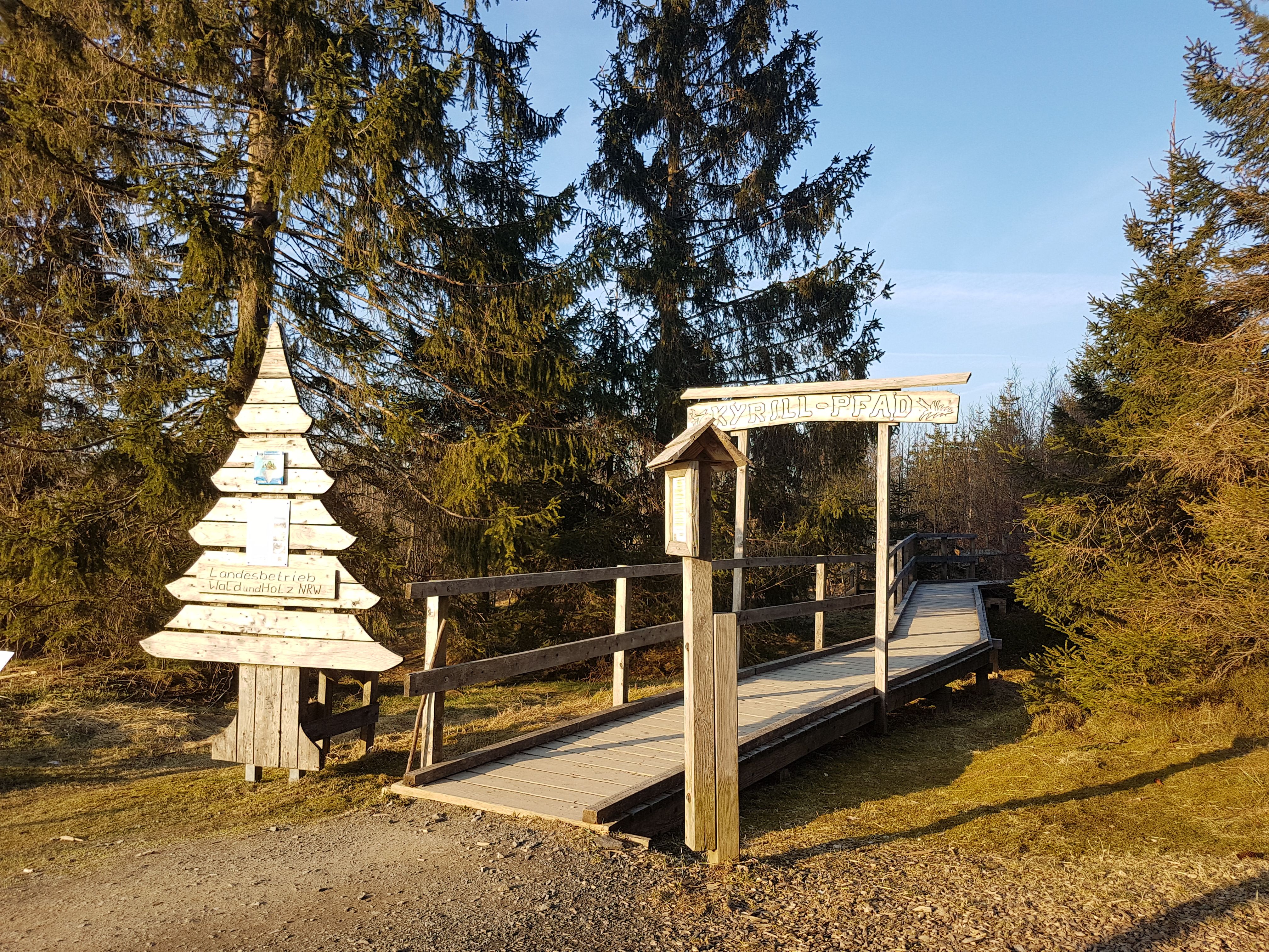 Während uns die Glocken des Klosters Grafschaft stimmungsvoll begleiten, biegen wir an den Gaststätten in historischer Fachwerk-Optik ab. Nicht nach links zur Minigolfanlage oder dem Spielplatz in der Parkanlage, sondern nach rechts. Ab der "Modellbahn am Rothaarsteig" zieht sich die Straße immer höher und höher und wir erleben auf den nächsten 4,5 Kilometern tiefgehende Blicke ins Land der 1.000 Berge. Beim Einparken in Schmallenberg-Schanze stellen wir es dann erstaunt fest: "Die Rückbank ist eingeschlafen!", schmunzelt mein Mann. "Das war wohl zu viel frische Luft und Bewegung für die Kinder. Möchtest du dich etwas umschauen vor dem Essen? Ich bleib' hier." – "Dank Dir. Dann bis gleich," bin ich einverstanden – und lasse mich hinter dem Ortsschild schnell vom ersten Wegweiser verführen: 600 Meter sind es ab dem Wanderportal zum "Kyrill-Pfad". Dieser offenbart sich mir als ein Kilometer langer Rundweg durch abenteuerliche Sturmholzflächen. Auch ein Holzsteg führt auf barrierefreier Route zu naturwüchsigen Ansichten. "Der Parcours durch wildes Terrain würde den Kindern gefallen", denke ich – und spüre nur wenige Schritte weiter die Magie, die der erhabene "Krummstab" versprüht: eines von elf imposanten Kunstwerken des "WaldSkulpturenWeg", der über den Rothaarkamm verläuft.