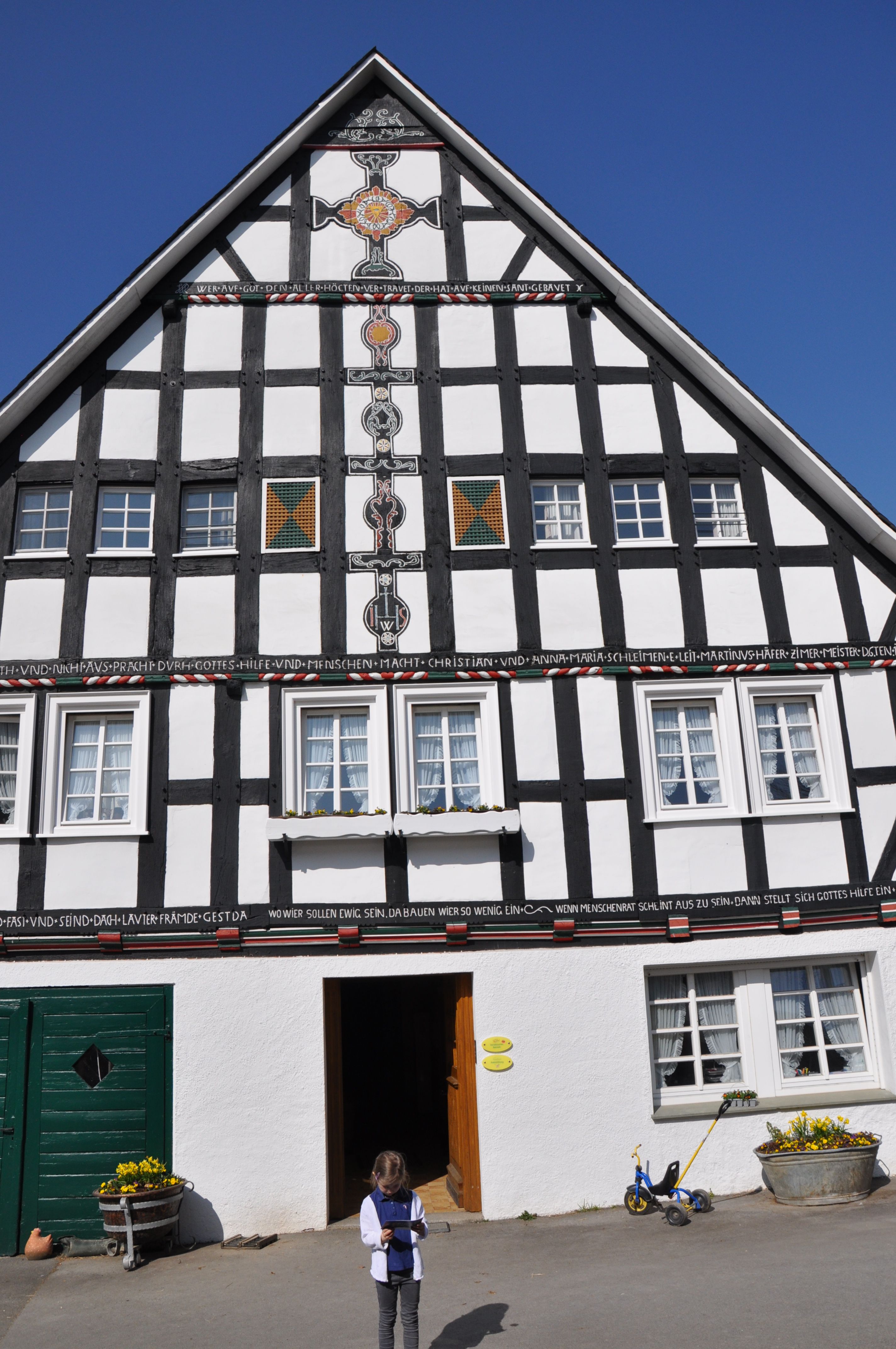 "Hey, hallo!", begrüßt uns Jalina Voß auf dem Bio-Ferienbauernhof Voß im beschaulichen Lenne. "Seid ihr Familie Wunderlich, mit der ich einen Termin zur Hofführung habe?", fragt sie uns vor großartiger Fachwerk-Kulisse – "Ja, genau. Urlaub auf einem Bauernhof möchten wir beizeiten unbedingt einmal machen." – "Da seid ihr im Sauerland ja genau richtig", ermuntert uns die Landwirtin. "Wenn Ihr möchtet, nehmt euch später die Broschüre 'Schmallenberger Kinderland' mit. Urlaubshöfe in unserer Region findet ihr aber auch auf der gleichnamigen Website. Doch, jetzt erst einmal los! Wir möchten die Tiere füttern. Seid Ihr dabei?" Mehr als gerne!