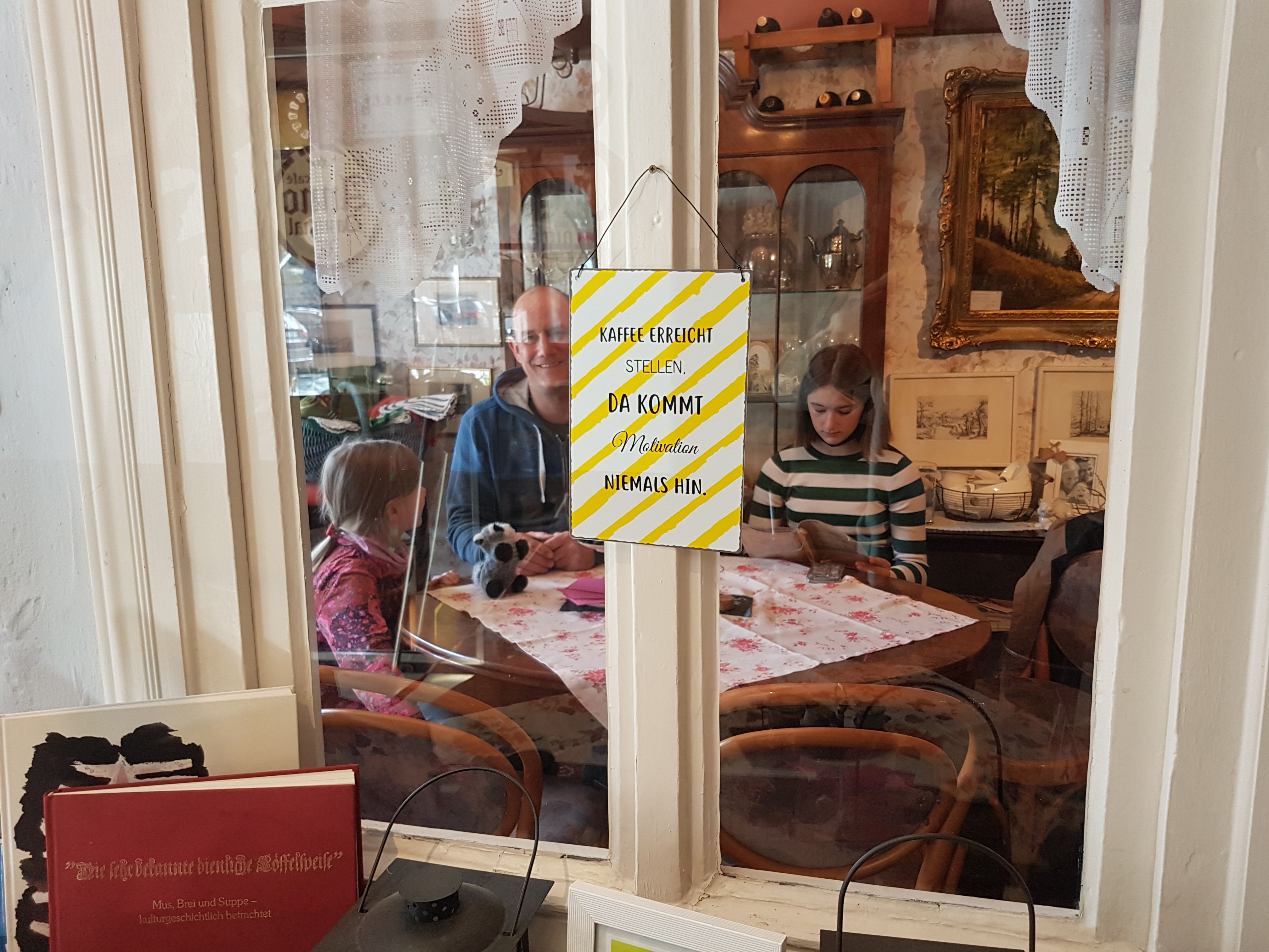 "Kommt rein in die kleine Stube", werden wir begrüßt. "Oder möchtet ihr lieber in der großen Stube sitzen?" Noch ist freie Platzwahl im Antiquitäten-Café "Anno Dazumal", das uns im Herzen der Altstadt begeistert: Erst einmal müssen wir über das originelle Ambiente staunen, bevor wir uns gemütlich zwischen Nostalgischem mit Blick auf das Fürstenhaus niederlassen. Nahezu alles, was wir um uns herum entdecken, könnten wir erwerben. Am Buffet suchen wir uns kurzum prächtige Torten- und Kuchenstücke aus. Lecker! So lässt sich die kommende Zeit genüsslich planen: "Also erst das Märchenquiz in der Touri-Info einlösen und dann abschließend rauf zum Wanderportal in Kühhude? – Alle sind einverstanden.