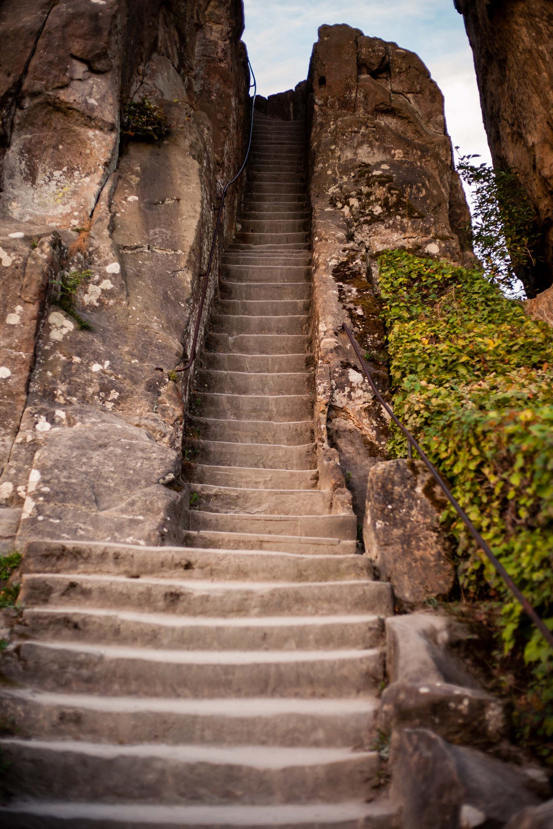 Ich könnte also behaupten, der Weg sei das Ziel. Das ist er sicher auch. Aber als sich dann plötzlich die Externsteine vor mir aufbauen, ist der Weg beinahe vergessen. Immer wieder habe ich mich gefragt, ob sie wohl halten, was sie versprechen. Ja! Sie tun es. Gewaltig ist der Anblick der Millionen Jahre alten, teils bizarren Sandsteinfelsen, die hier bis zu 40 Meter in den Himmel wachsen. Umgeben von einem Teich, in dem sich die herbstlich gefärbten Bäume spiegeln. Ich kann also nicht umhin, meine Höhenangst zu überwinden und über die steilen Treppen die Externsteine auch zu „besteigen“. Diesen Blick von oben will ich mir nicht entgehen lassen. Auch wenn ich froh bin, bald wieder „festen Boden“ unter den Füßen zu haben. Also noch ein letztes Foto, ein paar Dutzend habe ich heute schon gemacht, und schon neigt sich der Tag langsam dem Ende. Aber eine Verabredung habe ich heute ja noch. Und mein Abendessen in Jan’s Restaurant habe ich mir, wie gesagt, redlich verdient.
