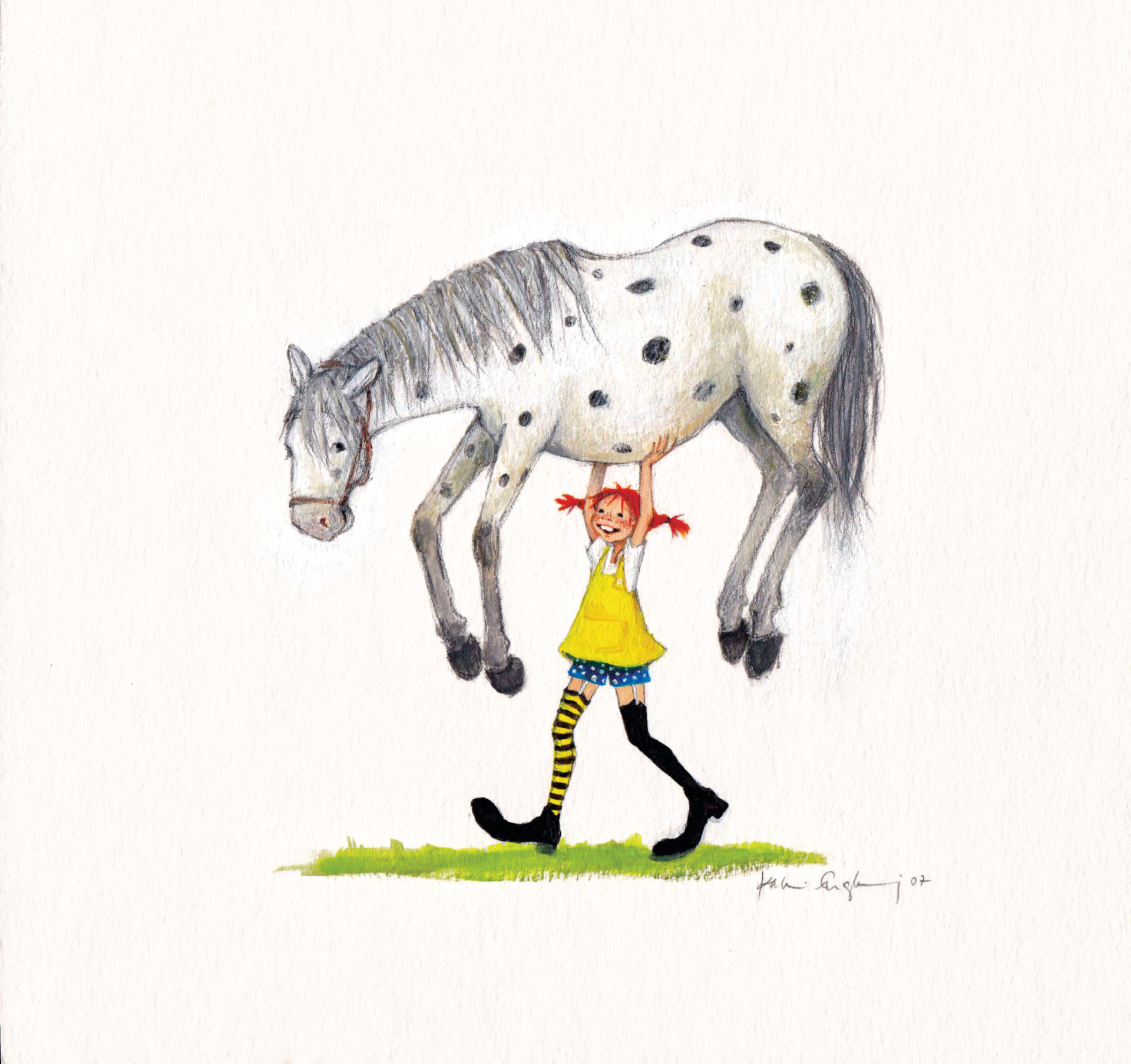Katrin Engelking, Verlag Friedrich Oetinger GmbH, Pippi Langstrumpf TM, The Astrid Lindgren Company, Pippi Langstrumpf und ihr Pferd Kleiner Onkel wurden häufig illustriert. In der Ausstellung können Gäste ikonische Darstellungen wie diese von Katrin Engelking kennenlernen