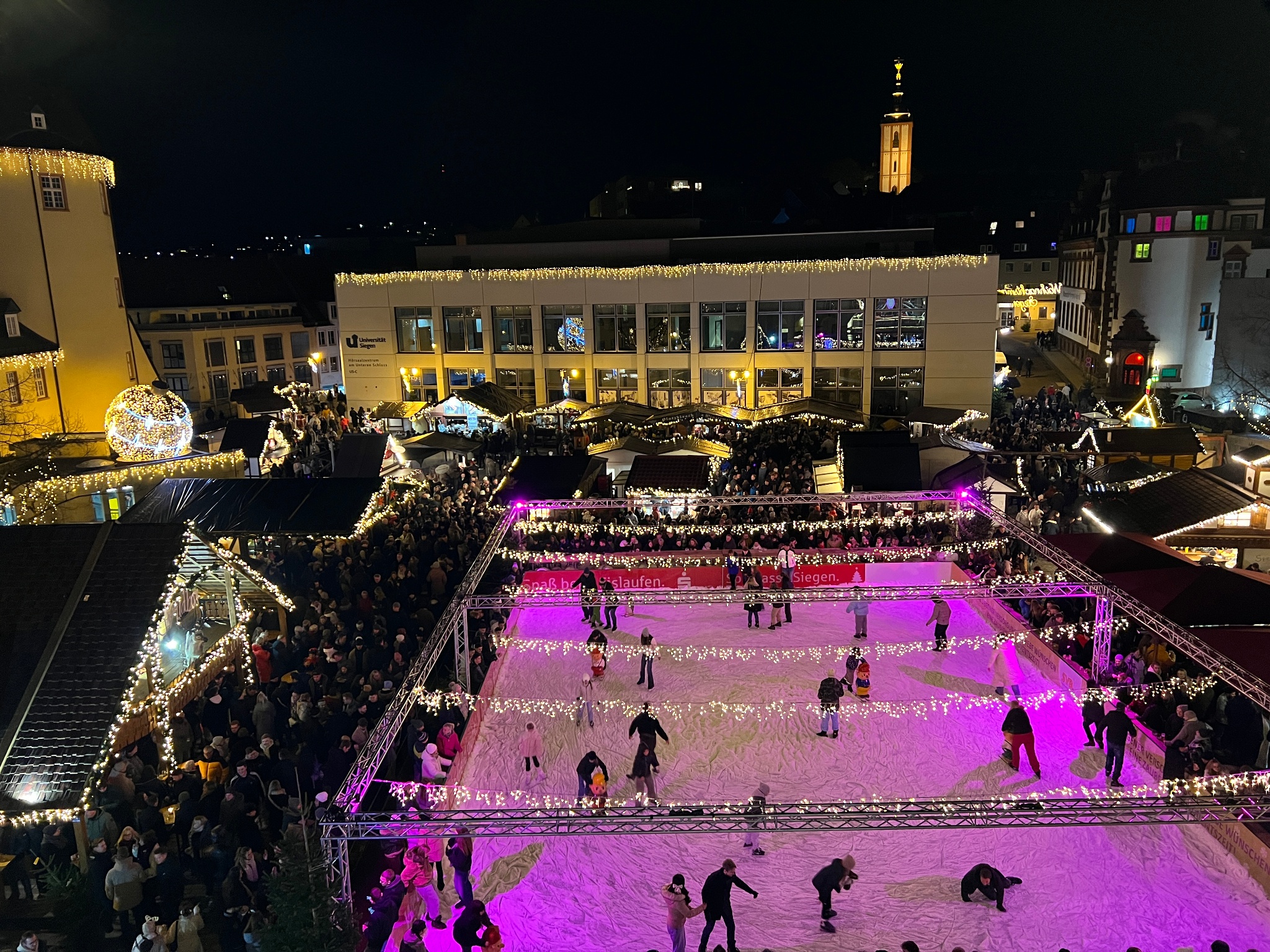 Der traditionelle Siegener Weihnachtsmarkt am Unteren Schloss bietet Dir eine einzigartige Atmosphäre mit festlich geschmückten Holzbuden. Du kannst eine Vielzahl an kulinarischen Genüssen entdecken, zum Beispiel Glühwein, Kaffeespezialitäten, verschiedene Biersorten und Punsch sowie Rostbratwurst, Reibekuchen, Langos, heiße Kartoffeln und die allseits beliebten Crêpes. Begleitet von klassischen Weihnachtsklängen und Live Musik findet dieser Weihnachtsmarkt auf dem Platz vor dem historischen Unteren Schloss in der Siegener Innenstadt statt. Ein besonderes Highlight für Dich ist die magische Eislaufbahn, die Deinen Besuch unvergesslich macht. Die 300 Quadratmeter große Echteisbahn lädt Dich wie auch alle anderen zum Schlittschuhlaufen ein, wobei Du die Schlittschuhe auch direkt vor Ort ausleihen kannst. Ein weiteres Highlight ist das mehr als 100 Jahre alte historische Holzriesenrad, das direkt neben der Eisbahn aufgestellt wird. Die Weihnachtsbuden findest Du auf dem Schlossplatz, in der Kölner Straße und auf der Sieguferbrücke.