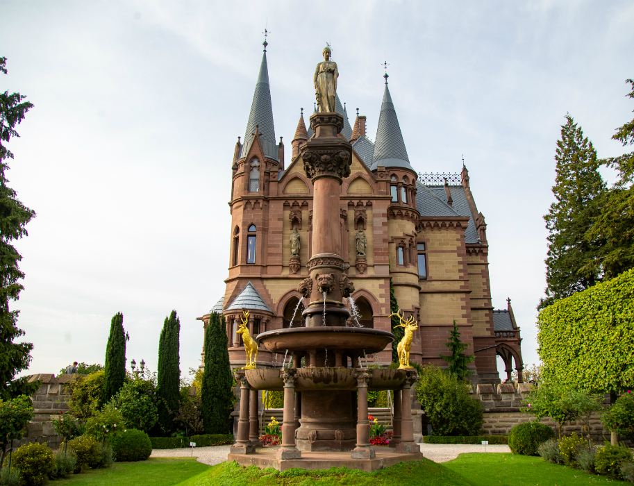 Schloss Drachenburg gGmbH, Goldene Hirschskulptur und ein Brunnen auf der Venusterrasse.
