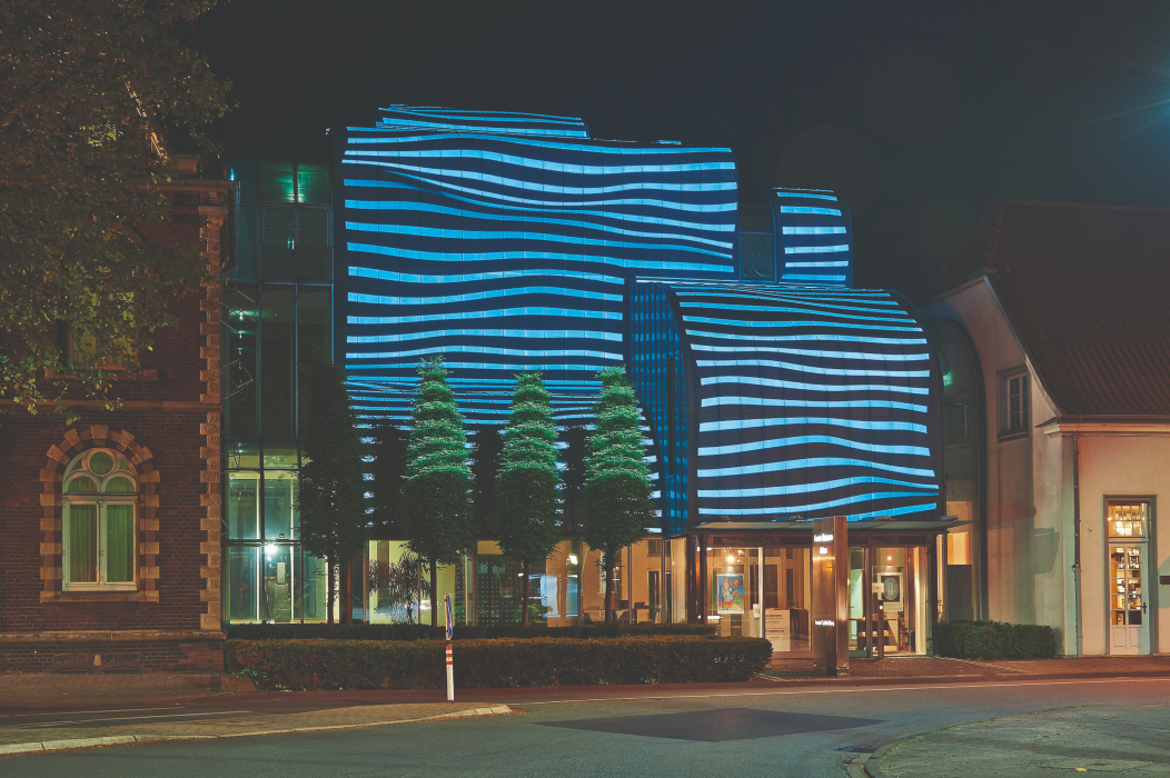 Apropos Lichtinstallation: Wenn die Dunkelheit am Abend in Ahlen einsetzt, bietet sich Gästen des Kunstmuseum ein besonderes Schauspiel. Die metallische Oberfläche des mittleren stählernen Verbundbaus erstrahlt dann dank Video-Projektion für rund drei Stunden in weißen Lichtstreifen, die sich mal langsam, mal schnell, mal gerade, mal wellenförmig in unterschiedliche Richtungen bewegen. Das Kunstwerk „Kaskade“ stammt von Egill Sæbjörnsson. Er hat die Installation zum 20-jährigen Bestehen des Kunstmuseums Ahlen im Jahr 2014 eingerichtet.