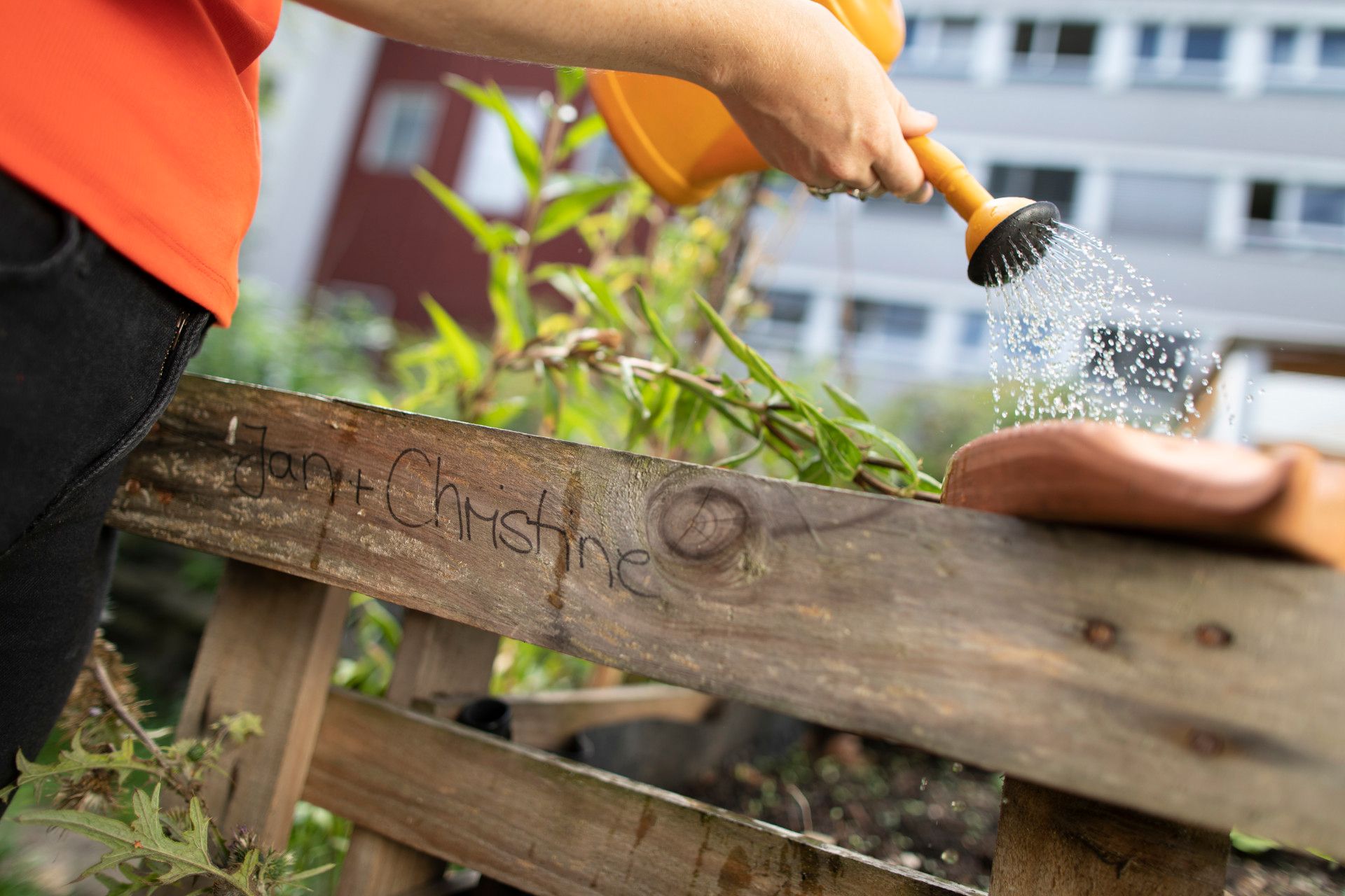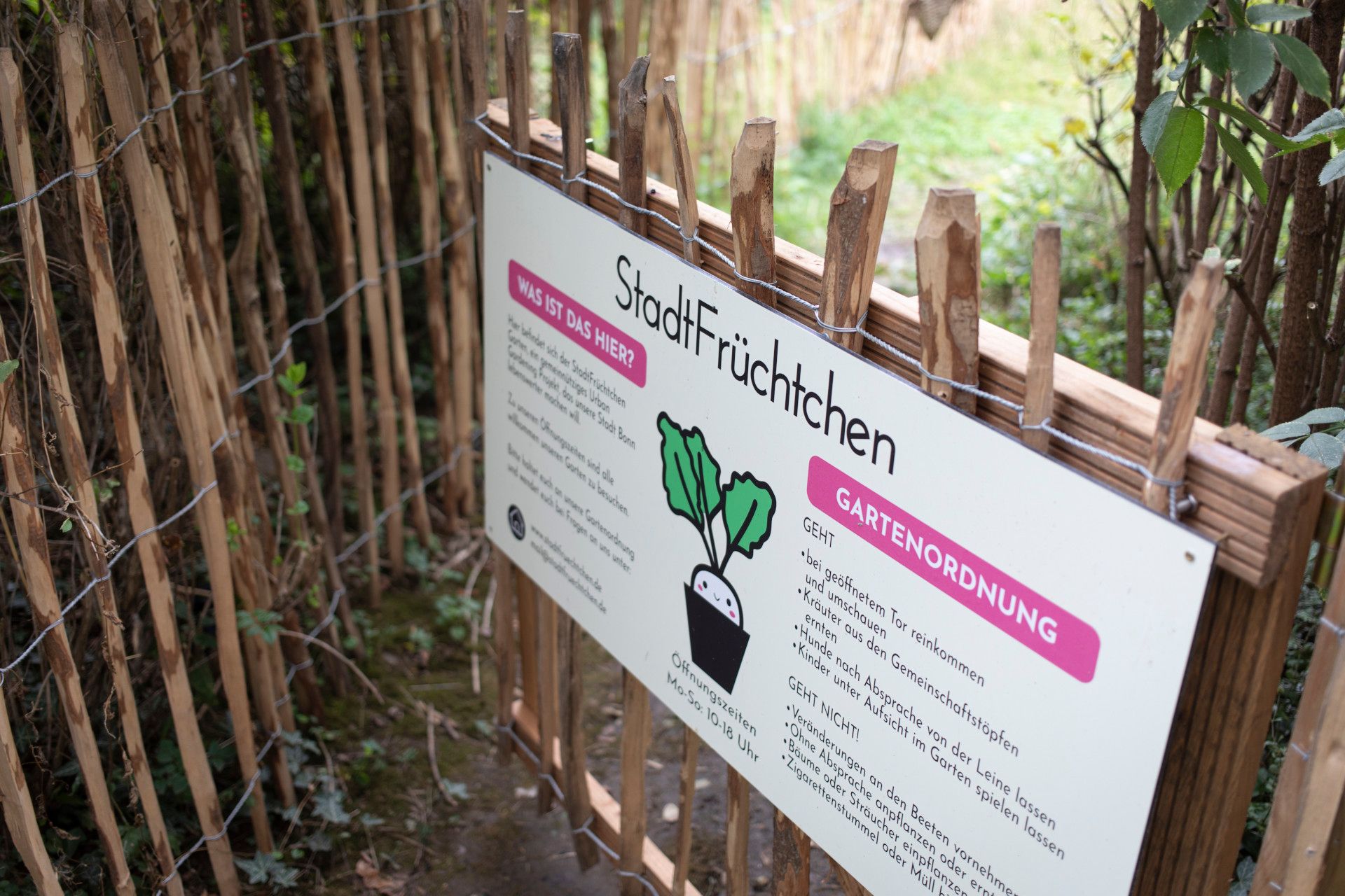 Tourismus NRW e.V., Ralph Sondermann, Stadtgarten Stadtfrüchtchen, Bonn Tourismus NRW e.V., Ralph Sondermann, Schild Stadtgarten Stadtfrüchtchen, Bonn Tourismus NRW e.V., Ralph Sondermann, Gemüsebeete in Stadtgarten, Bonn Tourismus NRW e.V., Ralph Sondermann, Gießkanne und Gemüsebeete in Stadtgarten, Bonn