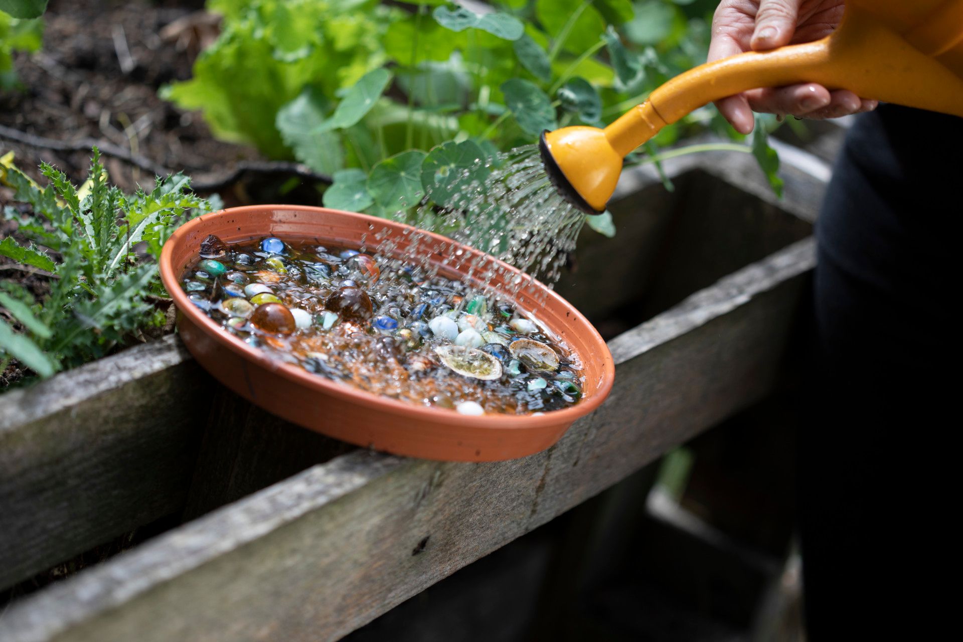 Ein Imker betreut die Bienenstöcke und kommt regelmäßig vorbei. Dann sind natürlich vor allem die Kinder neugierig. Angst aber müssen sie keine haben. „Die Bienen sind super sanft. Ich wüsste nicht, dass irgendjemand von uns mal gestochen worden wäre“, sagt Imke und zeigt auf die kleinen Tonschalen mit Murmeln und Wasser. Viele solcher Bienentränken stehen auf den Hochbeeten, für die übrigens 30 Euro Miete pro Jahr gezahlt werden müssen. Das Geld fließt in die Gemeinschaftskasse, aus der unter anderem die Pacht für das rund 600 Quadratmeter große Gelände bezahlt wird.