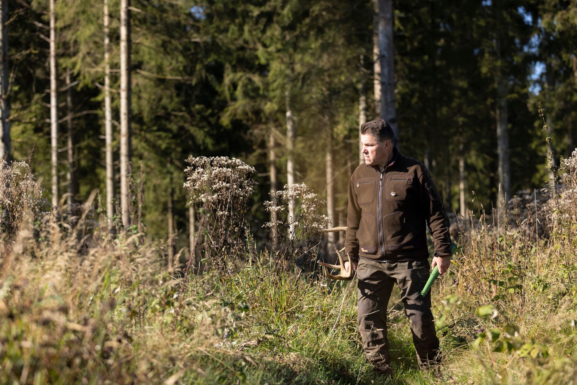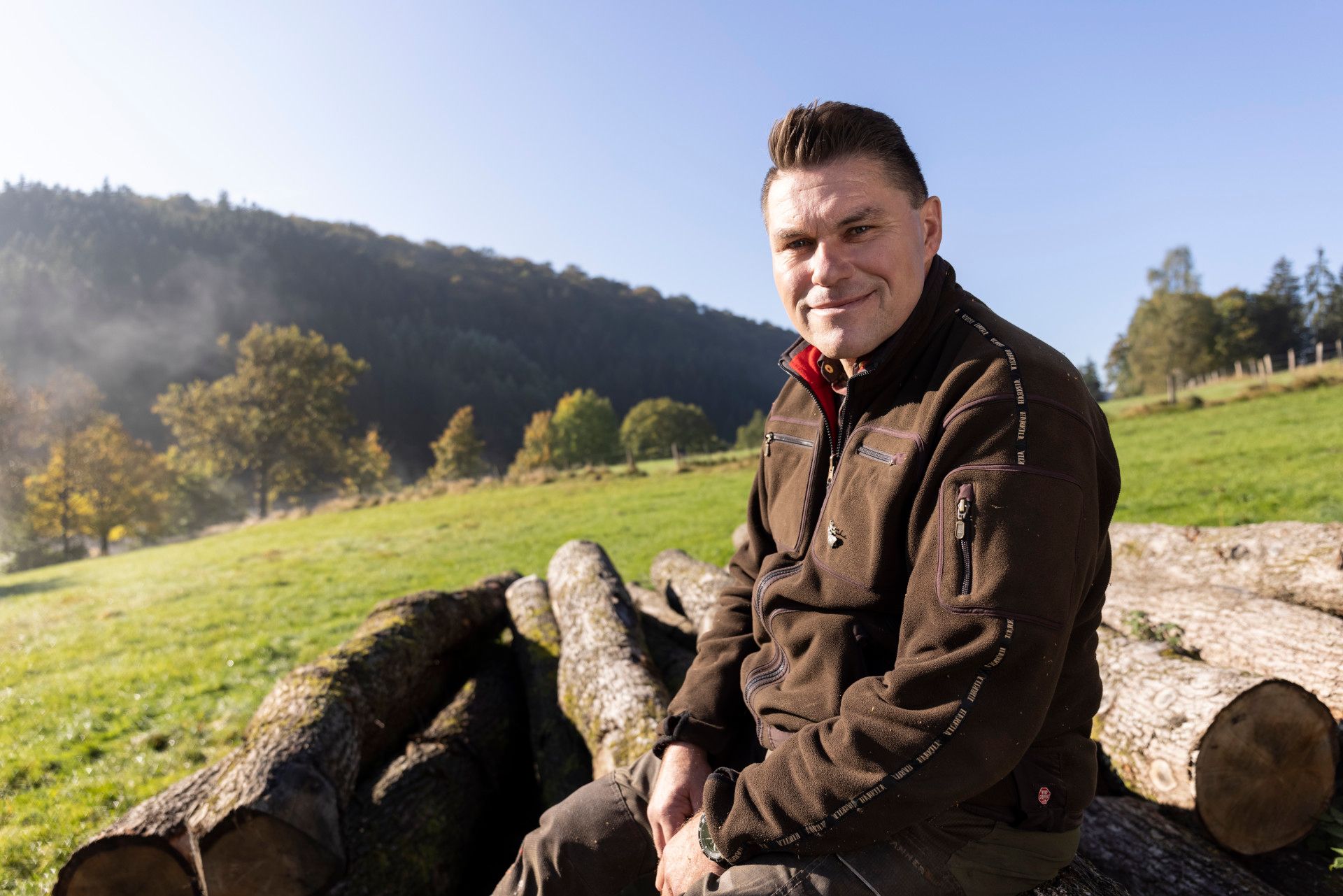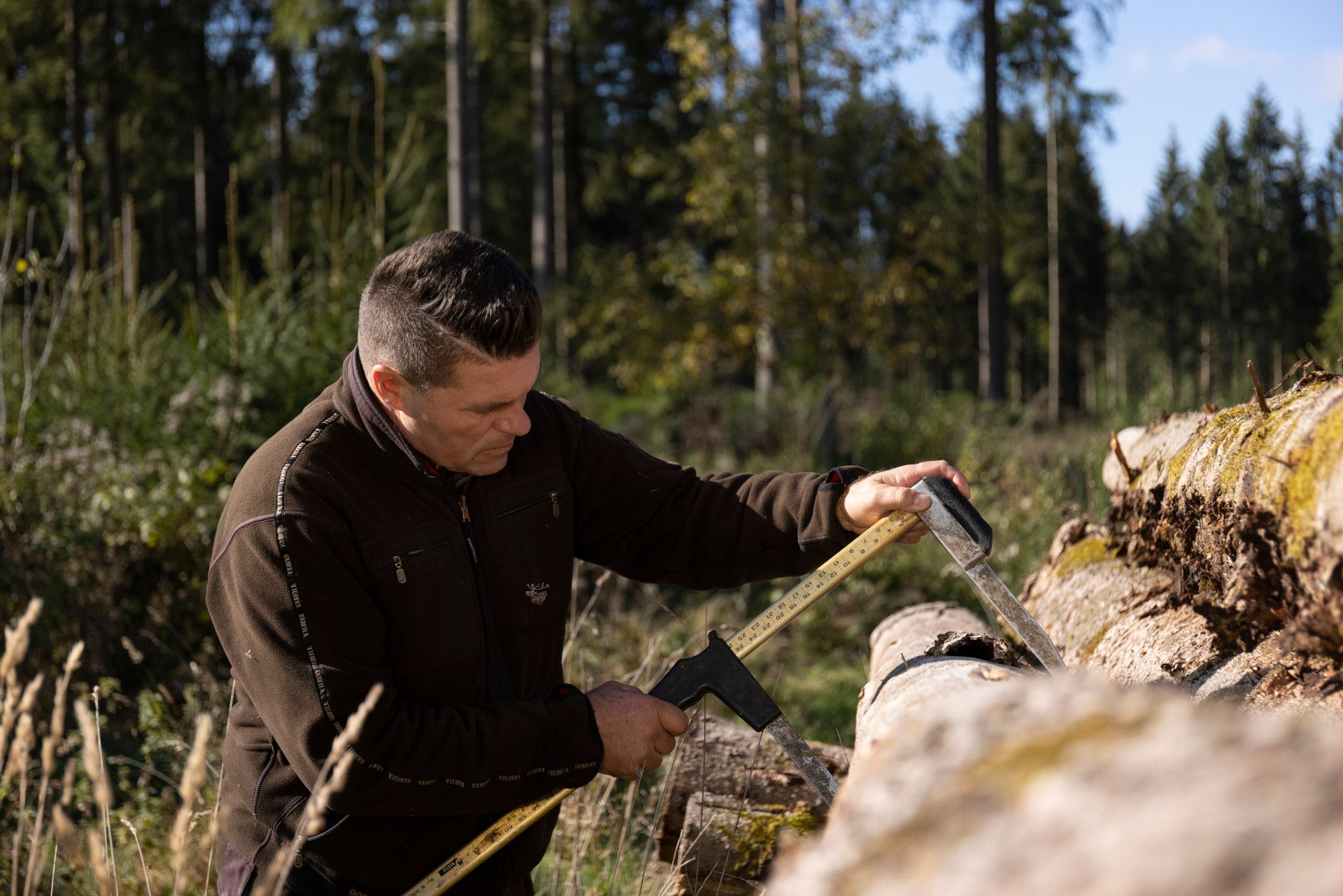Tourismus NRW e.V., Ralph Sondermann, Tasso Wolzenberg beim Baumstämmemessen, Siegen-Wittgenstein Tourismus NRW e.V., Ralph Sondermann, Wald und Gestrüpp, Siegen-Wittgenstein Tourismus NRW e.V., Ralph Sondermann, Tasso Wolzenberg auf Wiese, Siegen-Wittgenstein Tourismus NRW e.V., Ralph Sondermann, Schuhe auf Baumstamm, Siegen-Wittgenstein