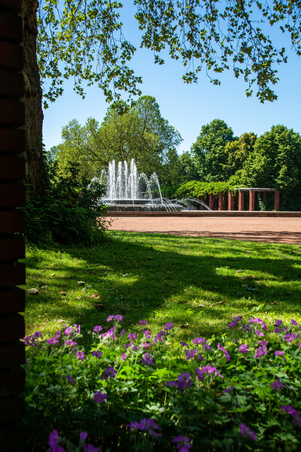 Von ihnen ausgehend führt der Weg zum Fontänenplatz, dem unbestrittenen Herzstück des Parks. Mit seinem kunstvollen Springbrunnen, den raumbildenden Säulengängen (Pergolen) und der angrenzenden Ausstellungshalle „Ballhaus“ zieht er die Gäste magisch an. Hier tanzen Wasserfontänen aus 160 Sprühdüsen in einer perfekt abgestimmten Choreografie. Das Spiel aus Bewegung, Licht und Reflexion verleiht der Szenerie einen fast meditativen Charakter. Besuchende verweilen, atmen tief durch und lassen das malerische Bild auf sich wirken.