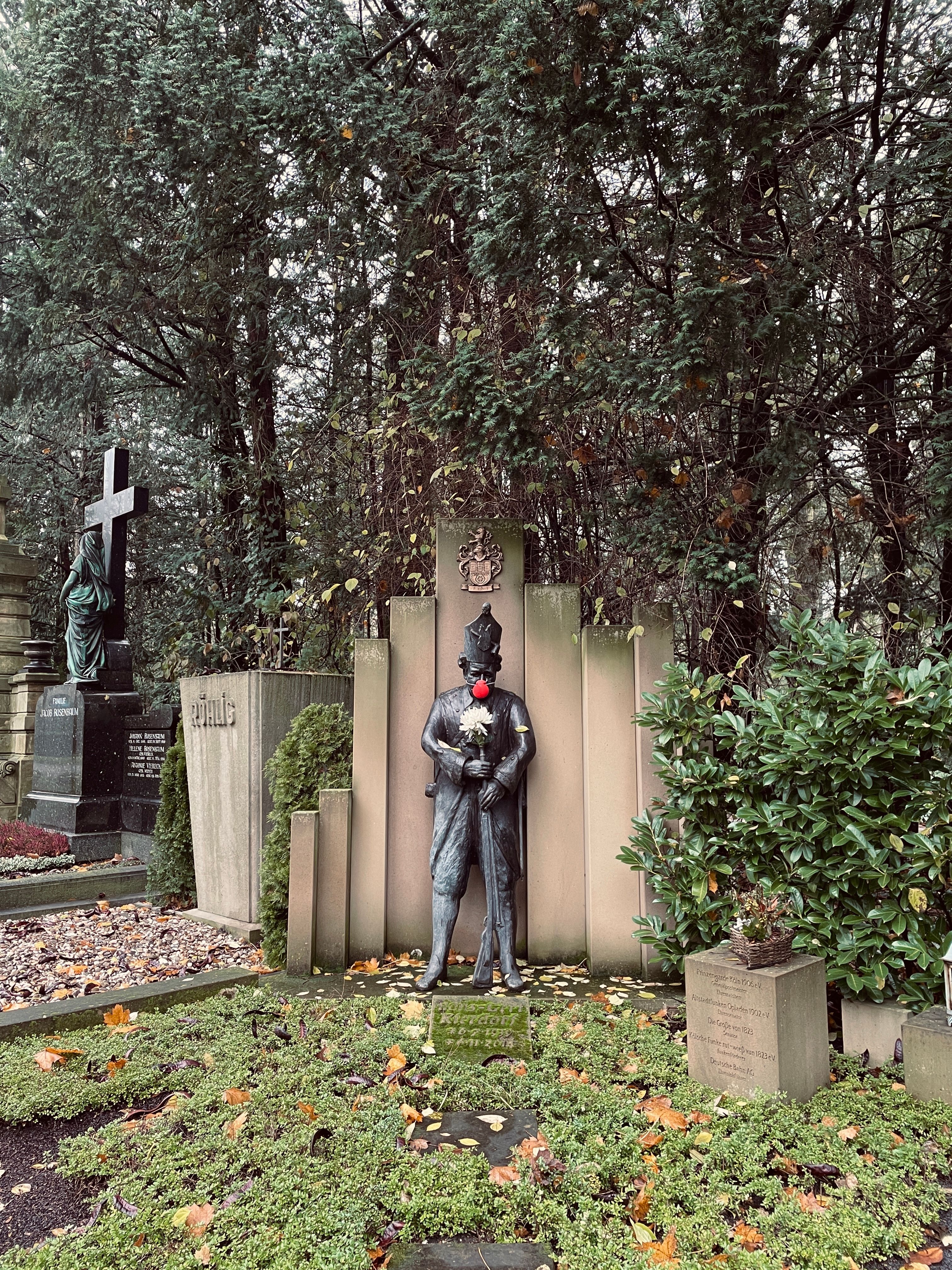 Weiter geht es – Richtung Melaten-Friedhof. Eine eindrucksvolle Parkanlage mit insgesamt 55.000 Gräbern und imposanten Denkmälern. Viele berühmte Kölner Persönlichkeiten sind hier beerdigt, etwa Willi Ostermann, Willi Millowitsch oder Dirk Bach. Und auch die Kölsche Lebensart finden wir hier: Eine rote Clownsnase ziert eine Statue, die einen Karnevalsmajor darstellt. Wir genießen die Ruhe, schlendern umher und beobachten ein Nüsse knabberndes Eichhörnchen.