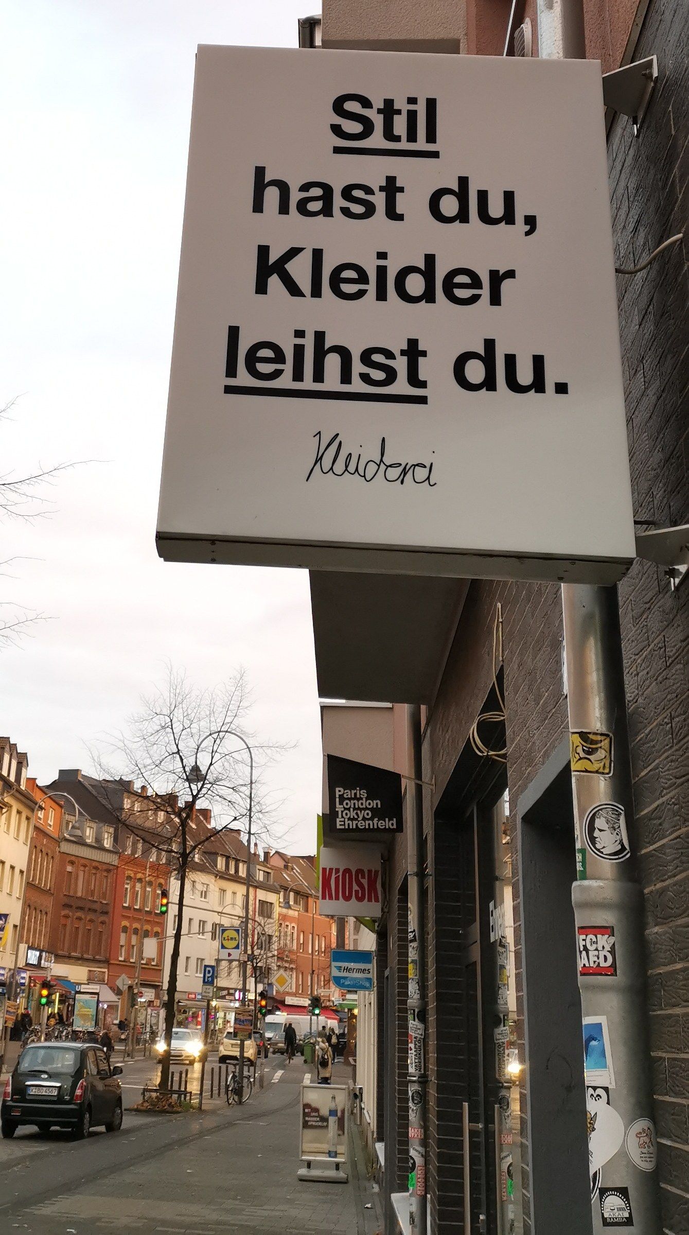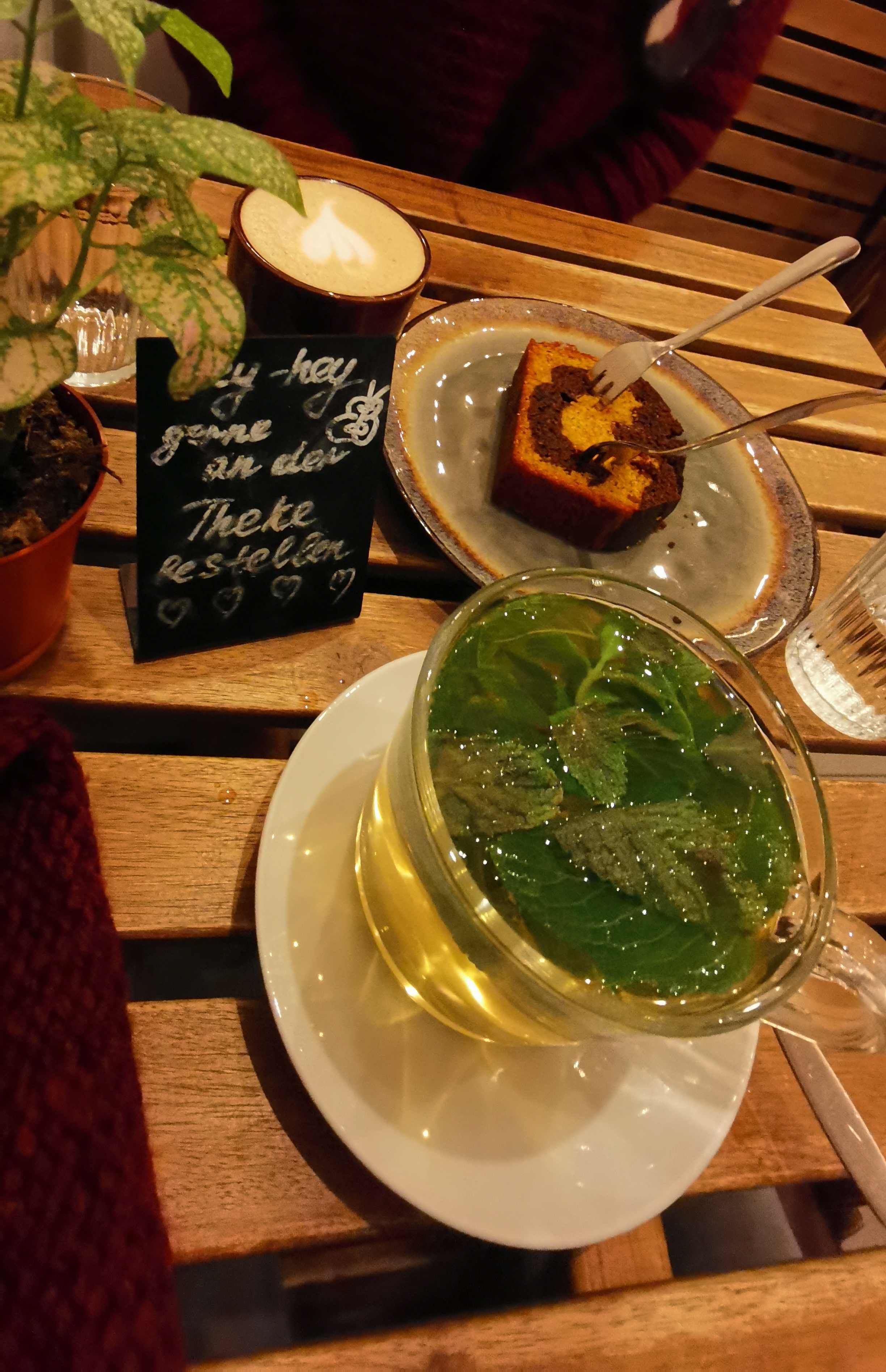 Frisch gestärkt bummeln wir weiter die Venloer Straße hinunter. In der „Kleiderei“, einem Secon-Hand-Laden, lassen wir uns das nachhaltige Konzept des Geschäfts erklären: Monatlich einen Betrag zahlen und dafür Kleider ausleihen, so gibt's Abwechslung in der Garderobe, aber keinen vollen Kleiderschrank. Da man hier auch Kleider kaufen kann, verfallen wir kurz in den Shopping-Modus. Wie wär‘s mit dieser Jacke? Stopp. Wir wollen doch noch mehr von Ehrenfeld sehen. Und langsam wird es dunkel. Wir denken an Kaffee, Tee & Kuchen und gehen auf die Suche. Das Schamong etwa ist Kölns älteste Kaffee-Rösterei. Wir entscheiden uns allerdings für "Ain Café" und trinken frischen Pfefferminztee, Cappuccino und teilen uns ein Stück Kürbis-Schoko-Kuchen.