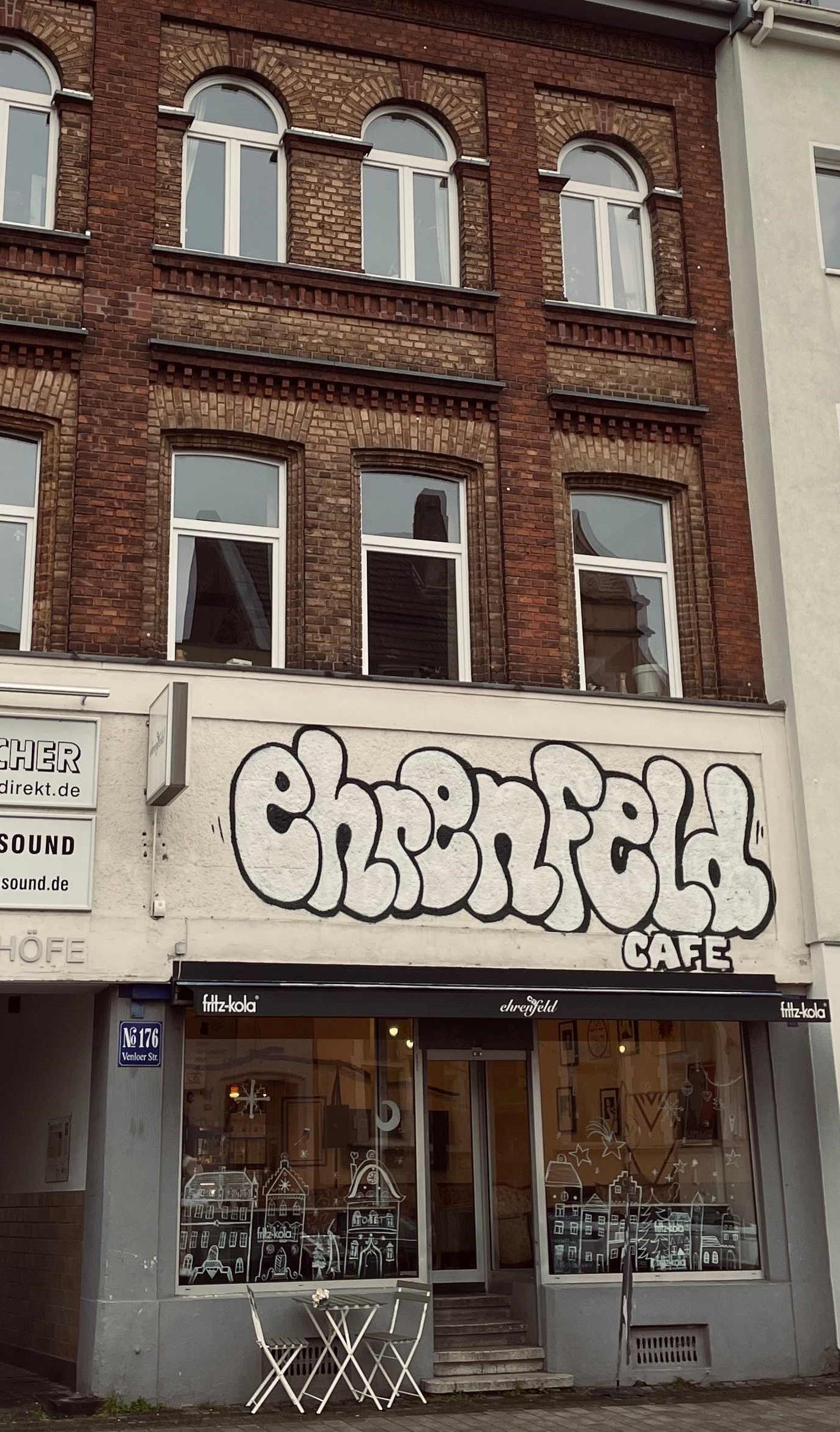 Vom Friedhof ist es nicht weit bis zur Kölner Großmoschee. Ihre Architektur und Größe sind imposant. Wer das Gebäude besichtigen möchte, kann an einer öffentlichen Führung teilnehmen. Wir haben die Ausmaße bestaunt und sind durch die kleine Einkaufspassage geschlendert, in der Eisdiele, Buchladen und Imbiss zu finden sind. Unser erster Pausenstopp ist das „Ehrenfeld Café“ in der Nähe, in der wir Türkischen Kaffee bekommen. Dazu noch ein Stück warmer Kuchen direkt auf dem Ofen. Lecker. Wir wärmen uns hier kurz auf, bevor es weiter geht. Richtung Körnerstraße.
