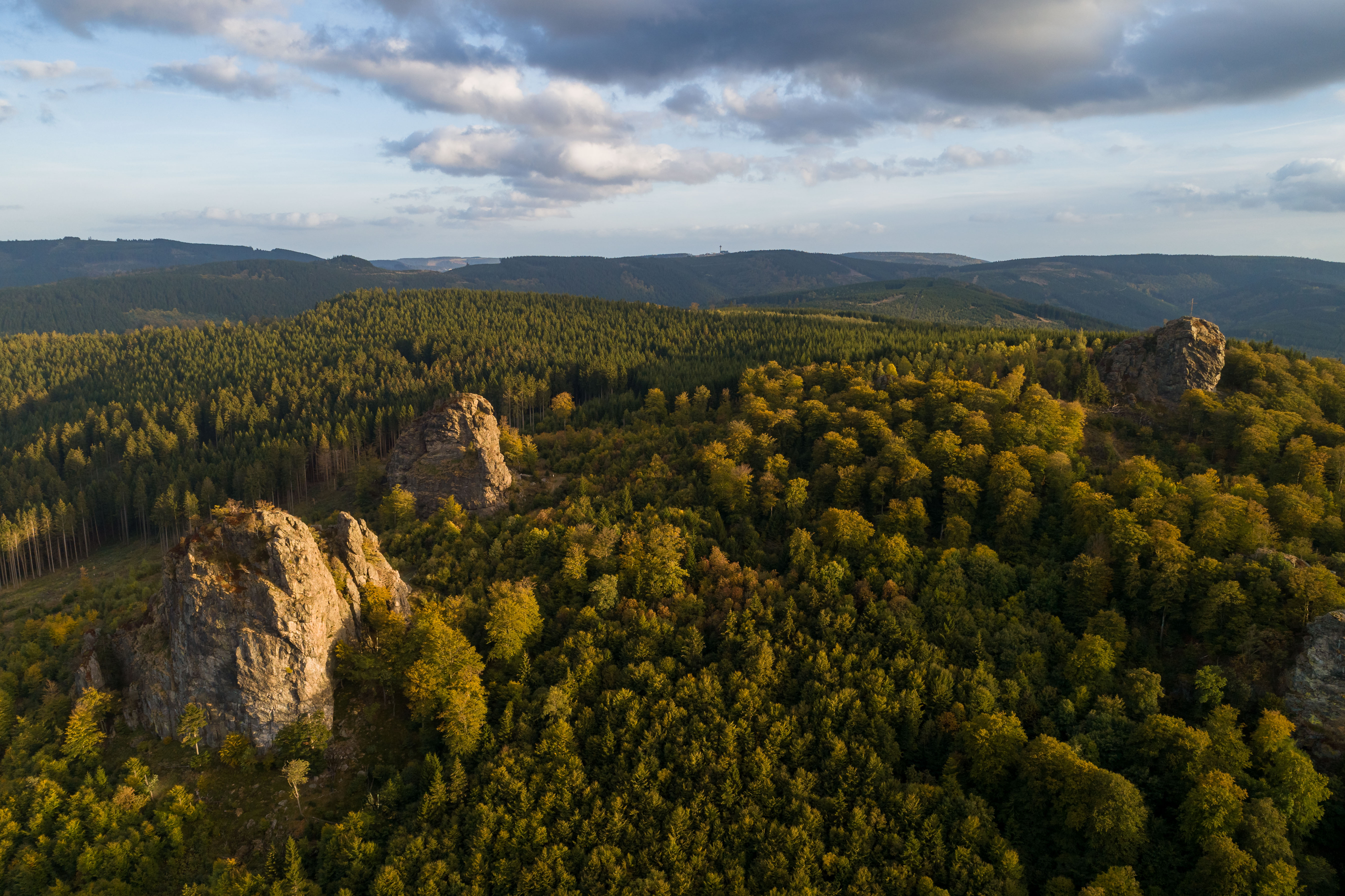 Landschaft mit Bruchhauser Steinen und herbstlichem Wald in Olsberg.